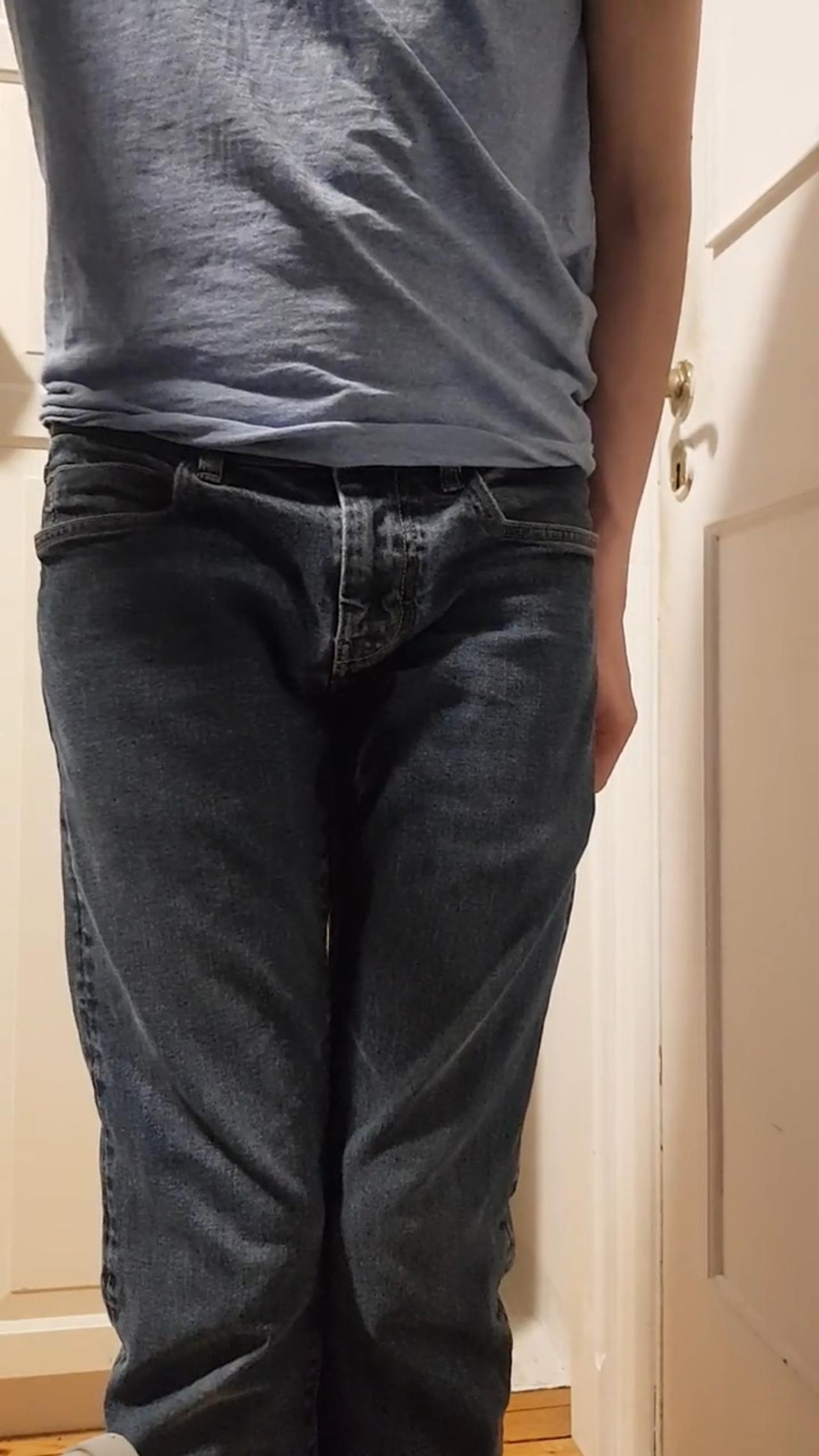 A diaper-clad boy feels the urge to pee in his jeans. He lets nature take its course, and a steady stream of pee fills his pants, soaking them thoroughly. The wet feeling against his skin is both uncomfortable and exciting.